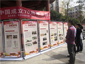 为庆祝新中国成立70周年,激发广大党员的爱国热情和工作的激情,2019年10月18日中午,白沙湾社区联合长沙东大肛肠医院党支部组织党员参观芙蓉公寓小区中心花园开展的新中国成立70周年主题展览活动。