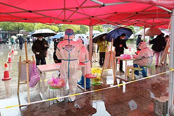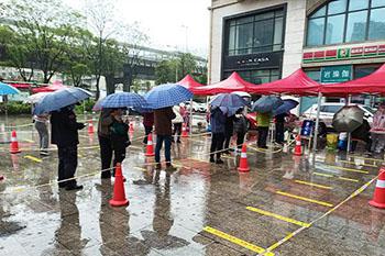 虽然天空还下着小雨,但前来进行核酸采样的社区居民们都自觉有序地排队,积极地配合医务人员开展核酸采样。而医务人员们也有条不紊、配合默契地开展核酸采样工作,使得本次任务顺利、有序、高效地完成。