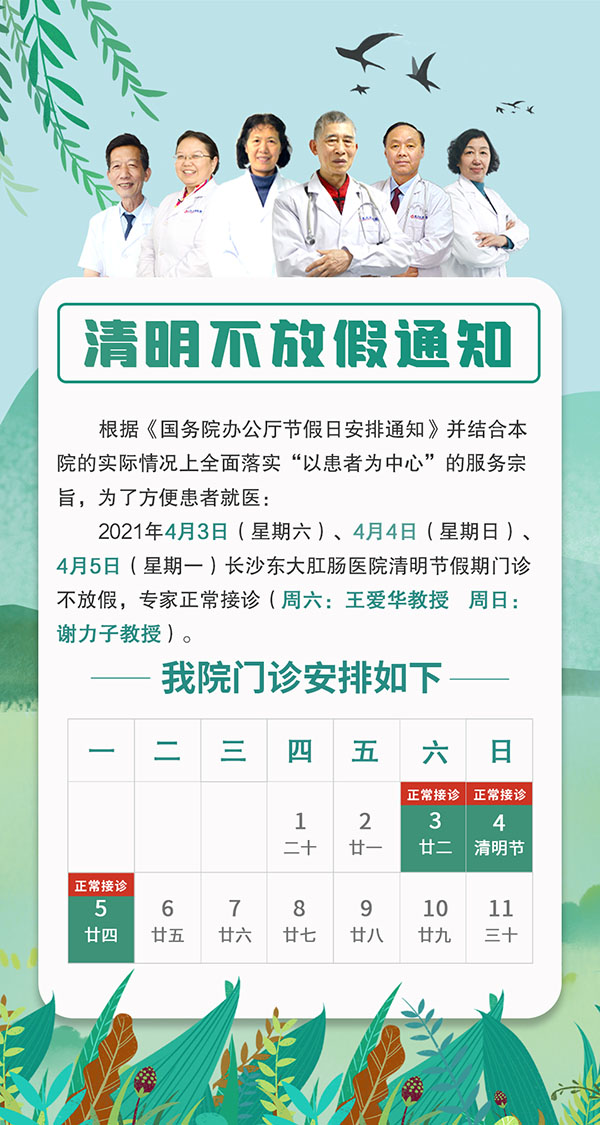 2021年4月3日(星期六)至4月5日(星期一)为清明节小长假,长沙东大肛肠医院医生照常接诊,为大家的健康保驾护航!