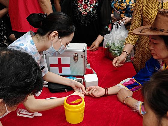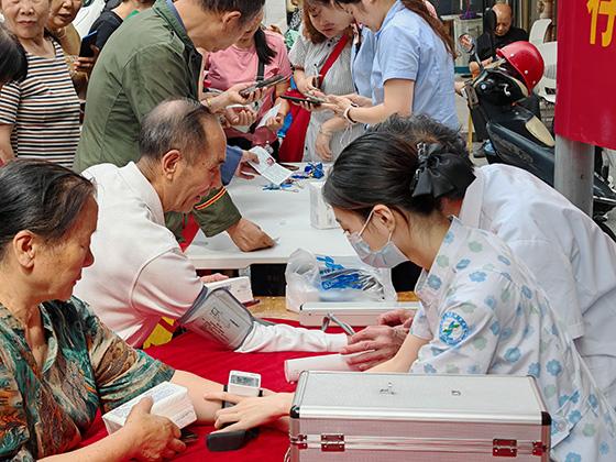 从上午九点开始,医院医护团队运用便携式检测设备为往来居民提供血压、血糖检测,结合数值变化给予针对性的健康提醒。同时根据老年群体常见的代谢问题,以通俗易懂的方式讲解日常养护要点,并科普消化道常见疾病预防知识。