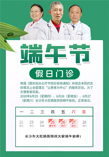 端午佳节即将来到,不少民众在计划着趁假期出游避暑,炎炎夏日,出游避暑也是很不错的选择,但如果身体有不适最好是利用端午假期治疗疾病。事实上,古代时端午节本来也是人们驱除瘟疫、祈求健康的节日,而在如今快节凑的现代生活下,人们更应该趁这个小长假为自己求一份健康保障。为此,在端午节6.25-6.27三天小长假期间,长沙东大肛肠医院医师假期无休,照常坐诊!