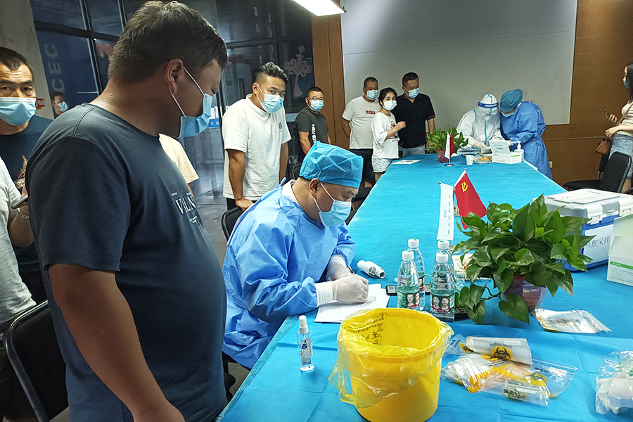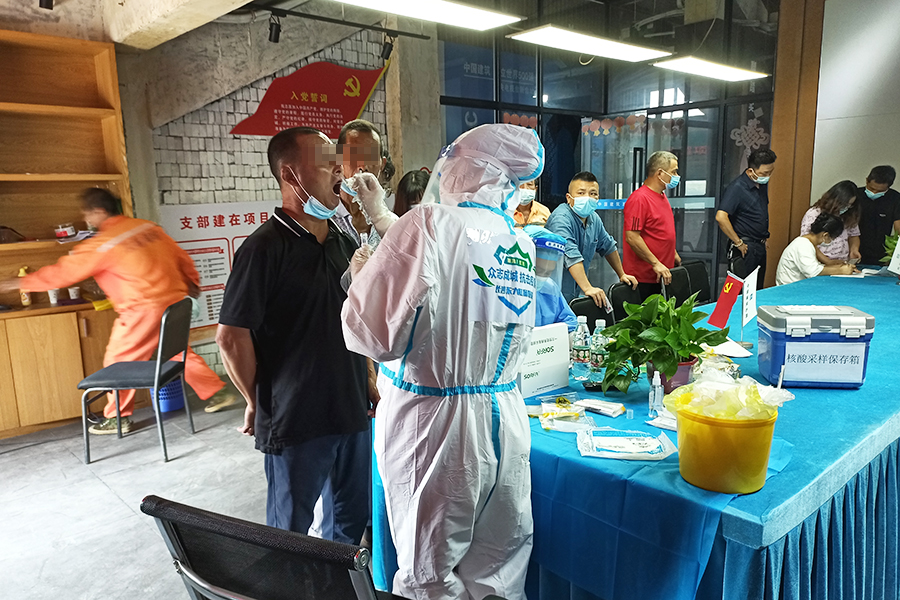 炎炎夏日,却挡不住他们抗击疫情、为人民服务的决心,在近40度的高温天气里,医生人员们穿着厚重的防护服,带着护目镜、口罩、隔离面罩,紧张而有序地开始为居民群众进行核酸采集,直至采样工作圆满完成。